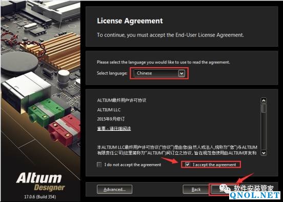 4.选择“Chinese”,再选择“l accept the agreement”,点击“Next”。
