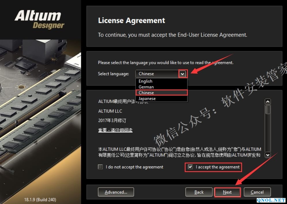 6.点击下拉菜单选择【Chinese】,勾选【I accept the agreement】,点击【Next】。