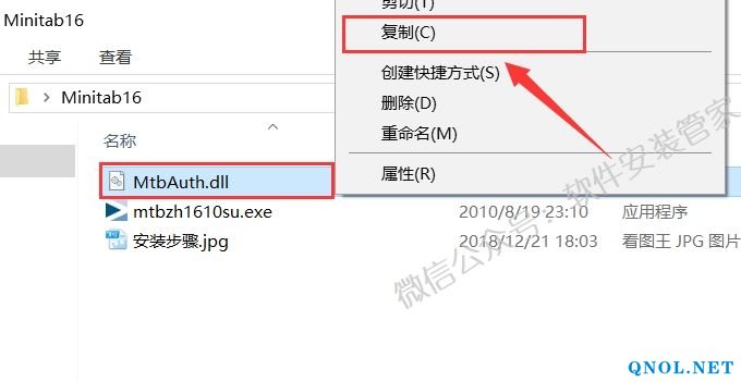 11.双击打开安装包解压后的【Minitab16】文件夹,鼠标右击【MtbAuth.dll】选择【复制】。