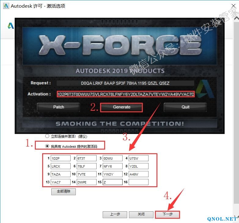 22.选择【我具有Autodesk提供的激活码】然后在注册机上点击【Generate】,全选【Activation】框中生成的激活码,使用快捷键Ctrl+C复制,再使用快捷键Ctrl+V粘贴至激活界面上【我具有Autodesk提供的激活码】文字下面的框中,然后点击【下一步】。