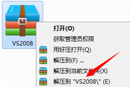 1、选择软件压缩包,鼠标右击选择解压到“VS2008”。