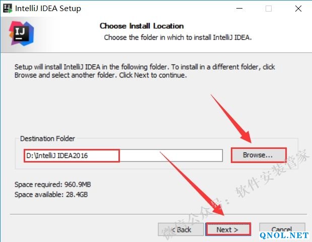 5.点击【Browse】更改软件的安装目录,建议安装在除C盘之外的磁盘,可以在D盘新建一个【IntelliJ IDEA2016】文件夹,然后点击【Next】。(注意这里的安装路径尽量和我的保持一致后面破解要用到路径)