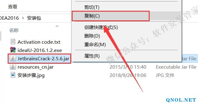 10.打开之前解压后的【IDEA2016】文件夹,选中【JetbrainsCrack-2.5.6】文件鼠标右击选择【复制】。