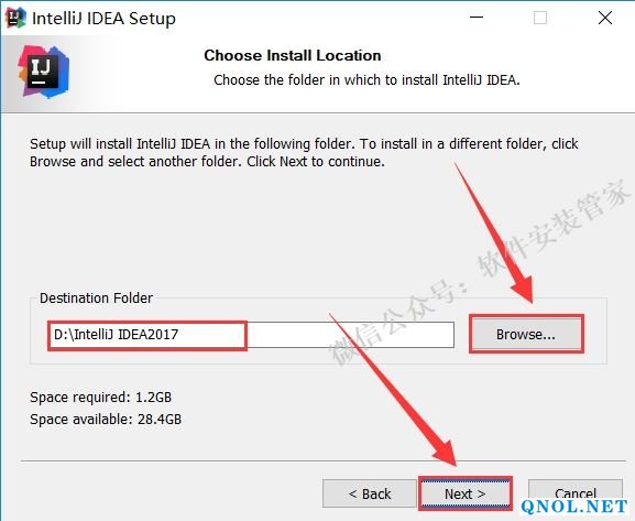 5.点击【Browse】更改软件的安装目录,建议安装在除C盘之外的磁盘,可以在D盘新建一个【IntelliJ IDEA2017】文件夹,然后点击【Next】。(注意这里的安装路径尽量和我的保持一致后面破解要用到路径)