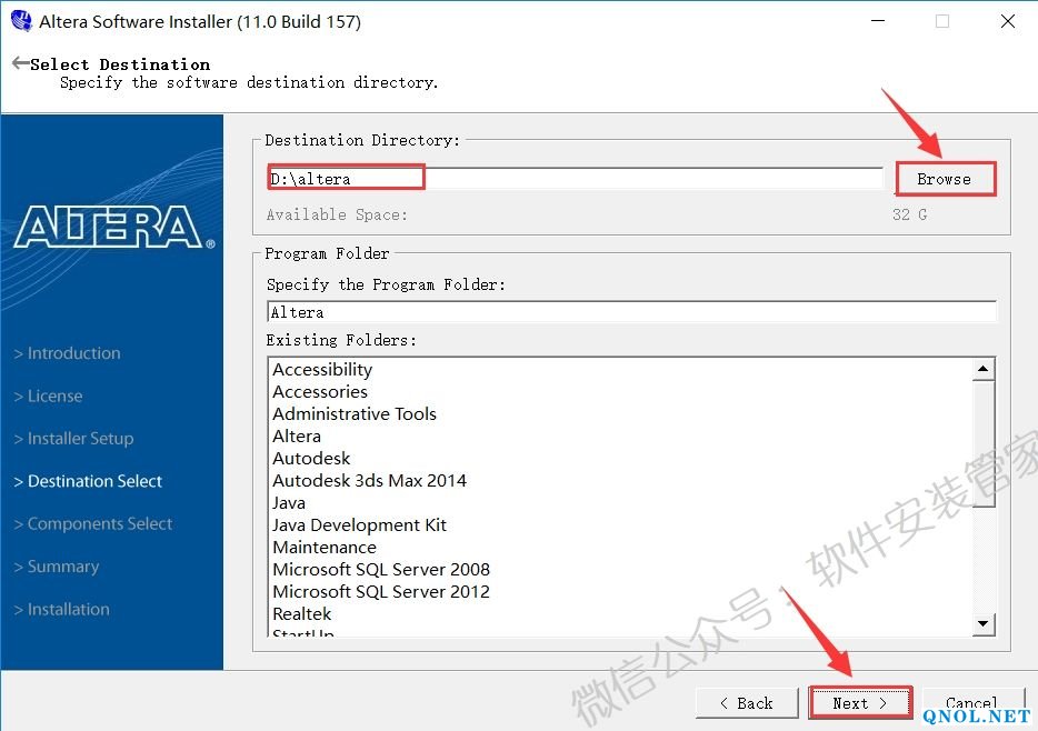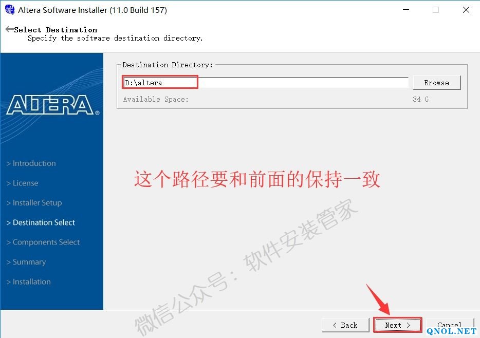 9.点击【Browse】更改软件的安装路径,建议安装在除C盘之外的其它磁盘,可以在D盘或其它磁盘新建一个【altera】文件夹,然后点击【Next>】。
