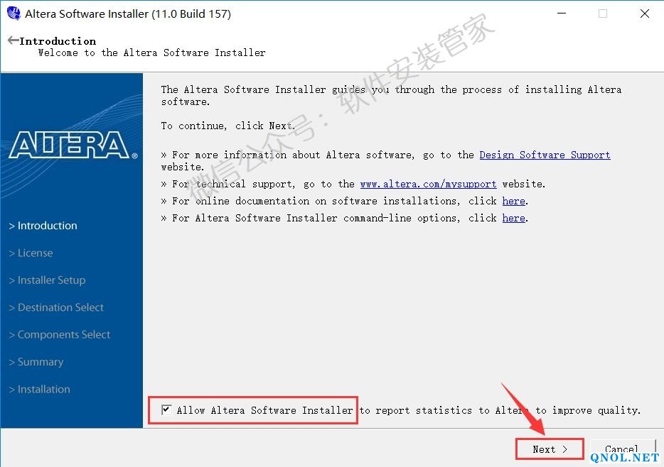 7.勾选【Allow Altera Software …】然后点击【Next>】。