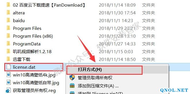 39.在D盘的根目录下选中【license.dat】文件,鼠标右击选择【打开方式】。
