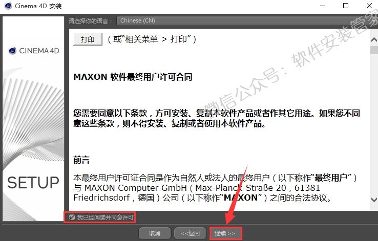 11.勾选“我已经阅读并同意许可”,然后点击“继续”。