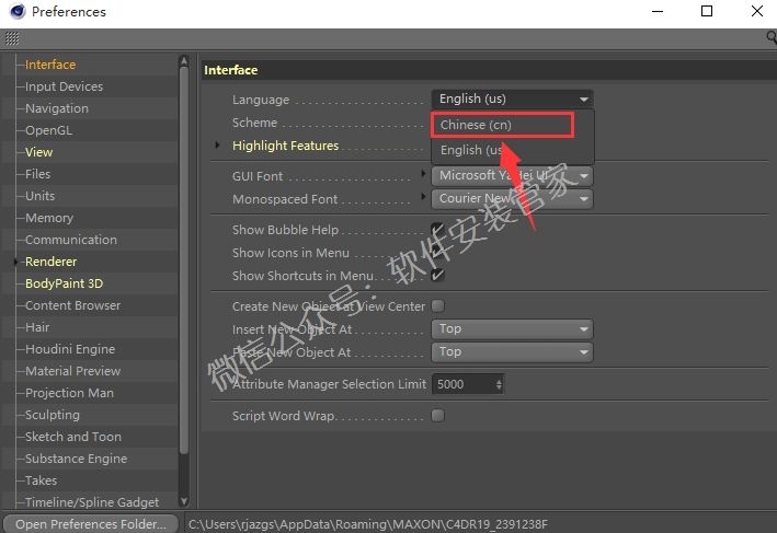 17.中英文切换,软件默认语言为英文,打开C4D软件后,按快捷键“CTRL+E”,弹出设置界面,在Language中选择Chinese,最后重启软件即可。