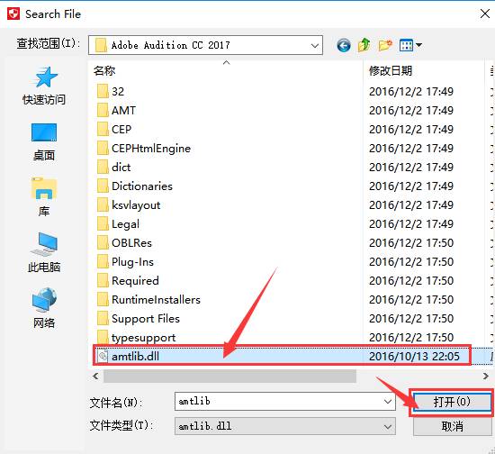 12.因为软件不能找到软件安装位置,所以需要手动寻找,在弹出的对话框中依次找到软件安装位置,选择“amtlib.dll”文件并打开;