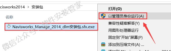 4.选中【Navisworks_Manage_2014_dlm安装包】可执行文件,鼠标右击选择【以管理员身份运行】。