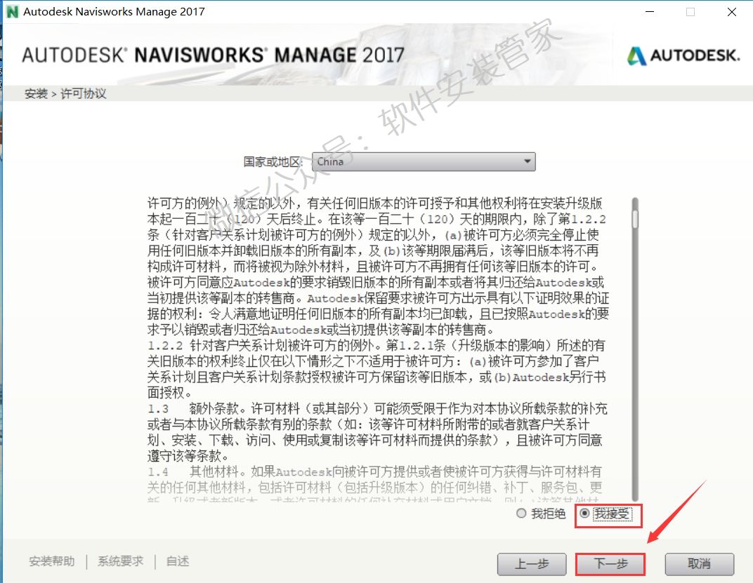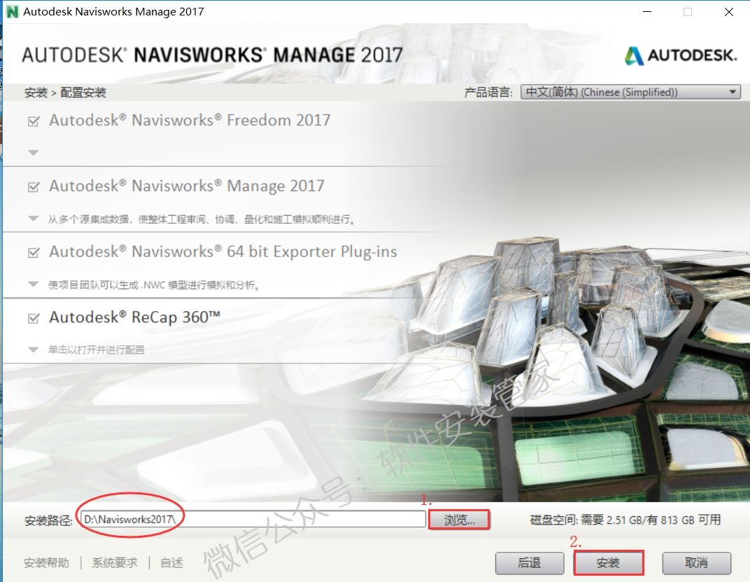 9.点击【浏览】更改软件的安装目录,建议安装在除C盘之外的磁盘,可以在D盘或其它盘里面新建一个【Navisworks2017】的文件夹,然后点击【安装】。