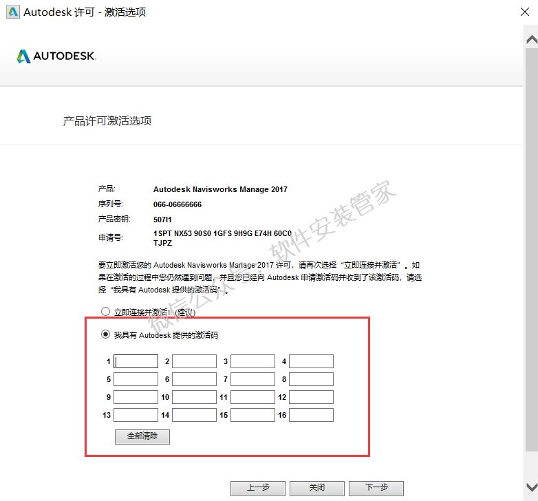 3.复制【Autodesk】提供的激活码时,直接全选激活码(快捷键Ctrl+A),复制激活码,点击【我具有Autodesk提供的激活码】在方框里面粘贴即可完成复制。