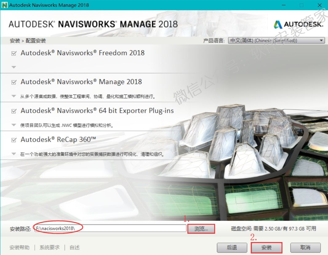 9.点击【浏览】更改软件的安装目录,建议安装在除C盘之外的磁盘,可以在F盘或其它盘里面新建一个【Navisworks2018】的文件夹,然后点击【安装】。