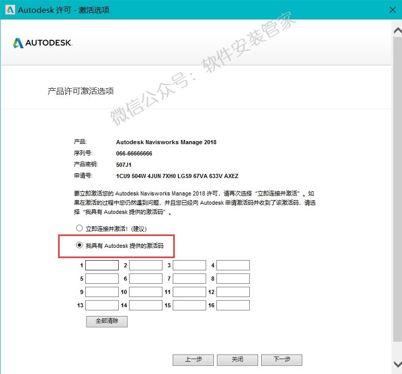 3.复制【Autodesk】提供的激活码时,直接全选激活码(快捷键Ctrl+A),复制激活码,点击【我具有Autodesk提供的激活码】在方框里面粘贴即可完成复制。