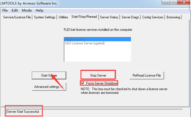 28. 在Start/Stop/Reread中选中下方复选框,点击Stop Server,然后点击StartServer,在下方显示Server Start Successful,关闭窗口