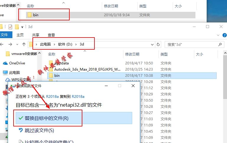 13.复制bin文件到安装路径下进行替换:打开安装包解压后的“MATLAB2018a_win64”文件夹,复制Crack文件里R2018a文件夹下的“bin”文件到安装目录下,并选择“替换目标中的文件”。
