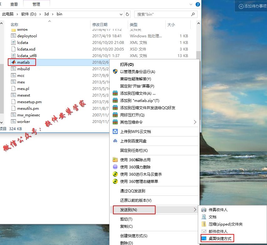 14.桌面没有MATLAB的启动快捷方式,在安装路径\bin下,鼠标右击“matlab”选择发送到桌面快捷方式。