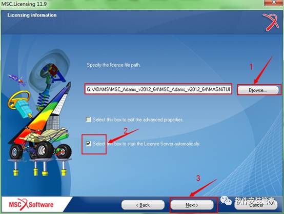 23、安装完成后会弹出以下界面,点击“Browse”选择前面生成的许可文件license.dat,路径C:\MSC.Software\MSC.Licensing\11.9\license.dat,然后点击Next。