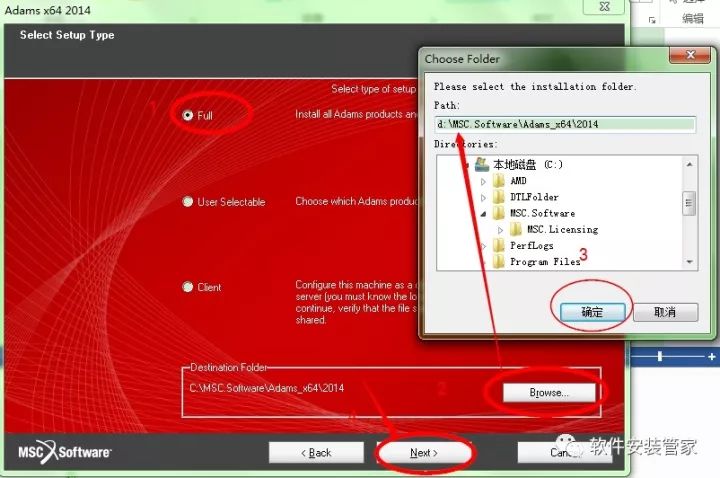 27、选择安装模式和安装目录,点击“FUll”,然后点击“Browse”更改安装路径,建议安装到除C盘的以外的其他磁盘,可在D盘新建一个Adams2014文件夹,然后点击Next。