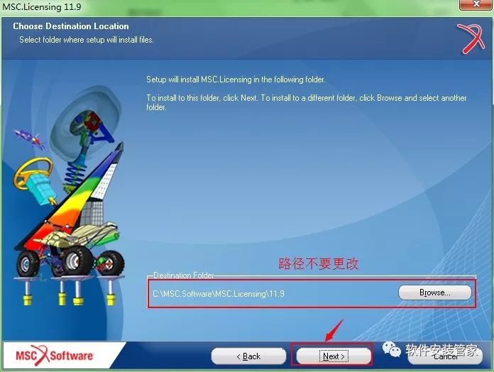 23、安装完成后会弹出以下界面,点击“Browse”选择前面生成的许可文件license.dat(许可安装中新生成的),路径C:\MSC.Software\MSC.Licensing\11.9\license.dat,然后点击Next。