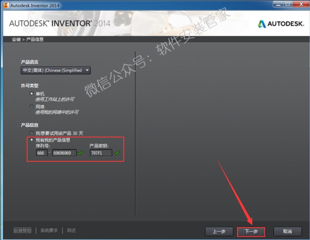 7.输入序列号:666-69696969,产品密钥:797F1,然后点击【下一步】。