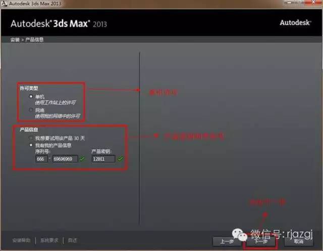 5、许可类型和产品密钥、序列号,最上面一栏是许可类型,这里有两种,一种是单机许可,另外一种是网络许可,勾选单机许可。接下来是下面的序列号和产品密钥 ,序列号有这么几组,666-69696969, 667-98989898, 400-45454545。产品密钥128E1(标准版)