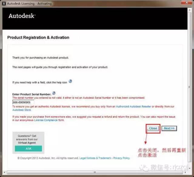 11、产品激活到这里,我们并没有看到我们安装之前版时的输入激活码界面 :这里有两种方法激活,一种是选择断网,另外一种就是本教程要讲的:点击关闭(close),然后返回到3dsmax2013 32位中文版激活界面,重新点击激活