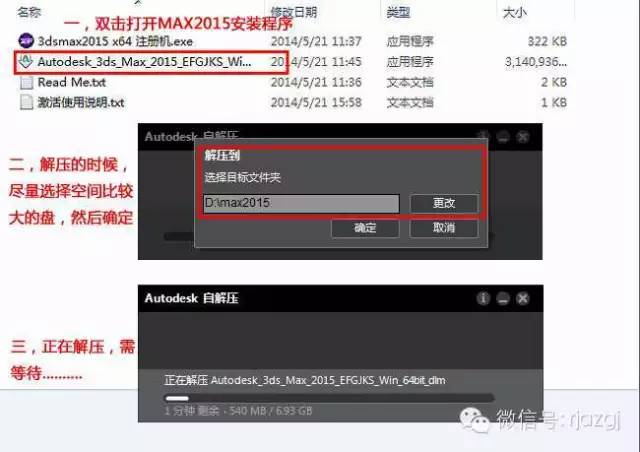 1、首先双击打开MAX2015安装程序,然后会弹出解压路径,这里尽量选择空间较大的盘符,然后就开始解压
