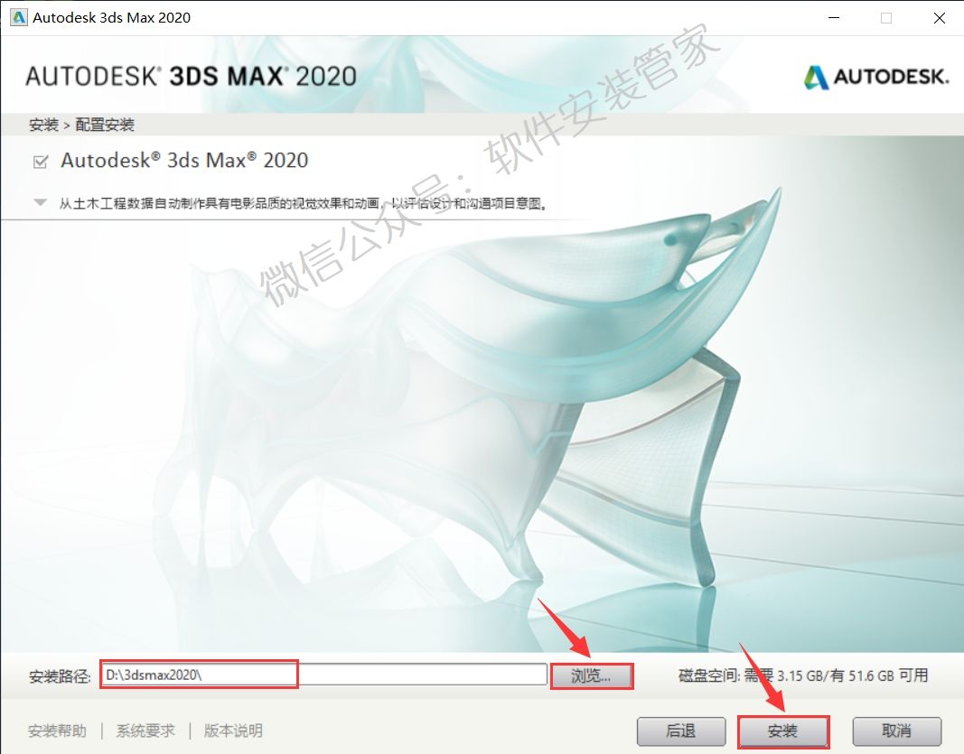 7.点击【浏览】更改软件的安装路径,建议安装在除C盘之外的其他磁盘,可以在D盘或其他盘新建一个【3dsmax2020】文件夹,然后点击【安装】。