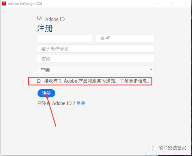 7. 姓名随便写,需要是英文,邮箱也随便写,但要好记,因为一会还要用这个邮箱登陆。(邮箱是不需要验证的,这一步只是要通过这个Adobe ID 将软件成功安装上)密码(建议:Abcd123456)填完后点击 注册