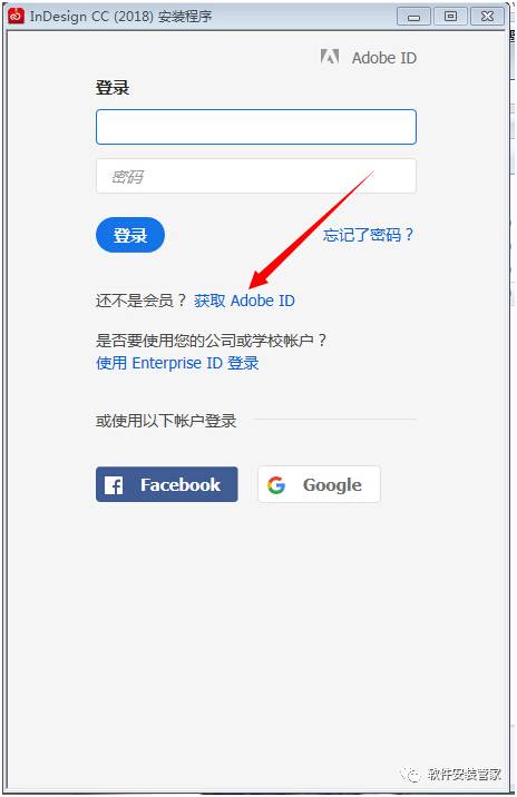 3、首次使用,安装的时候我们需要注册一个账号。点击“获取Adobe ID”;已经有帐号的用户可以直接登录。