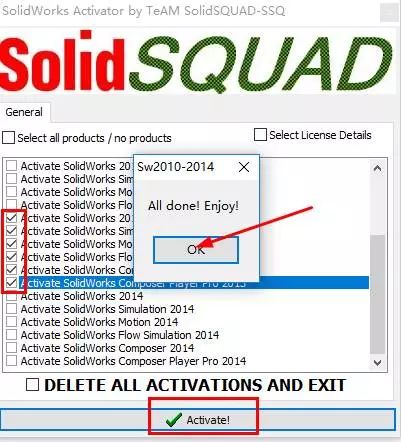 10.勾选Activate solidwroks2013所有项目,点击Activate,最后点击OK