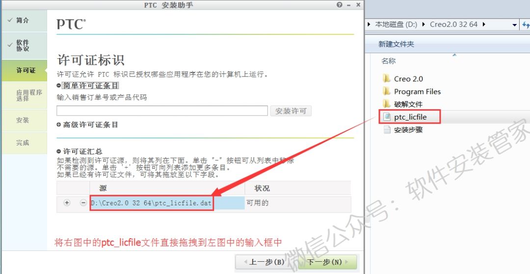 22.在解压出的文件夹中找到“ptc_licfile”文件,直接拖拽至如图所示位置。