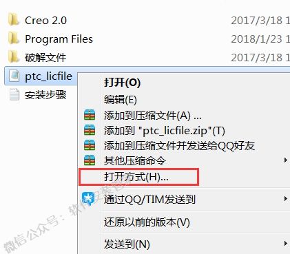 4.在解压出的文件夹中找到“ptc_licfile”鼠标右击选择“打开方式”。
