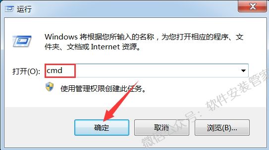 6.键盘“Win+R”打开运行面板,输入“cmd”后,点击确定。