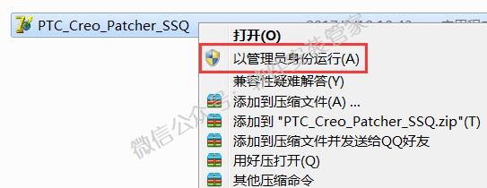 33.选中“PTC_Creo_Patcher_SSQ”后,鼠标右击选择“以管理员身份运行”。