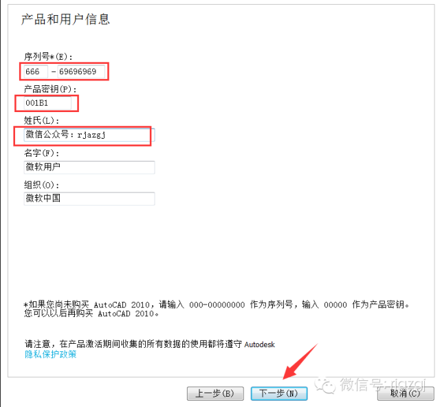 7.序列号输入:666-69696969,密钥输入:001B1,姓氏随便输入(我输入微信公众号:rjazgj)