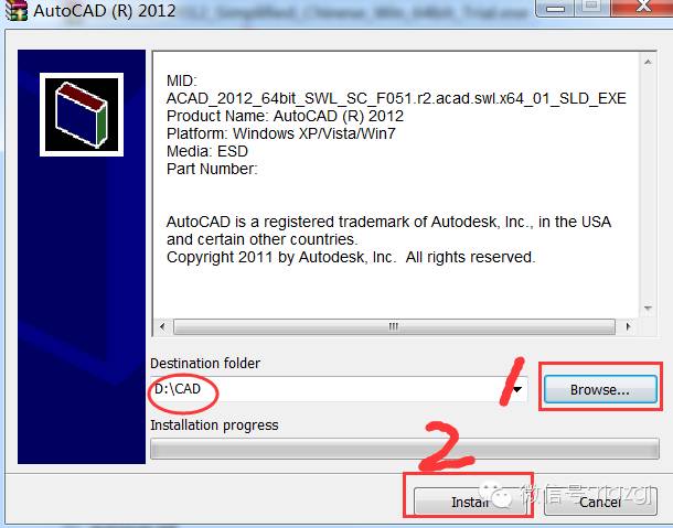 3.点击Browse选择解压目标文件夹,可在D盘或其它盘里面新建一个CAD文件夹,然后点击Install(大概需要5分钟左右)。