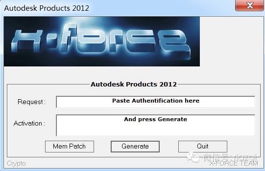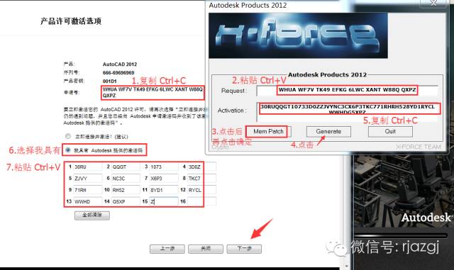 13.把申请号复制到注册机里面的Request中(记得删除原Request中的内容),先点击Patch,再点击Generate后复制Activeation中生成的激活码,然后粘贴激活码至我具有Autodesk提供的激活码方框中。最后点击下一步即可。