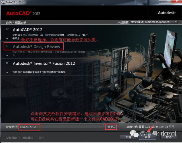 7.关于第二项Autodesk Design可以选择安装,也可以不选,最好不要选择,否则有可能导致最后安装失败。点击浏览更改软件安装路径:建议安装到除C盘以外的磁盘,可在D盘或其它盘里面新建一个文件夹CAD2012。点击安装。