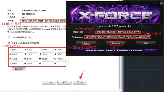 16.把申请号复制到注册机里面的Request中(记得删除原Request中的内容),先点击Patch,再点击Generate后复制Activeation中生成的激活码,然后粘贴激活码至我具有Autodesk提供的激活码方框中。最后点击下一步即可。