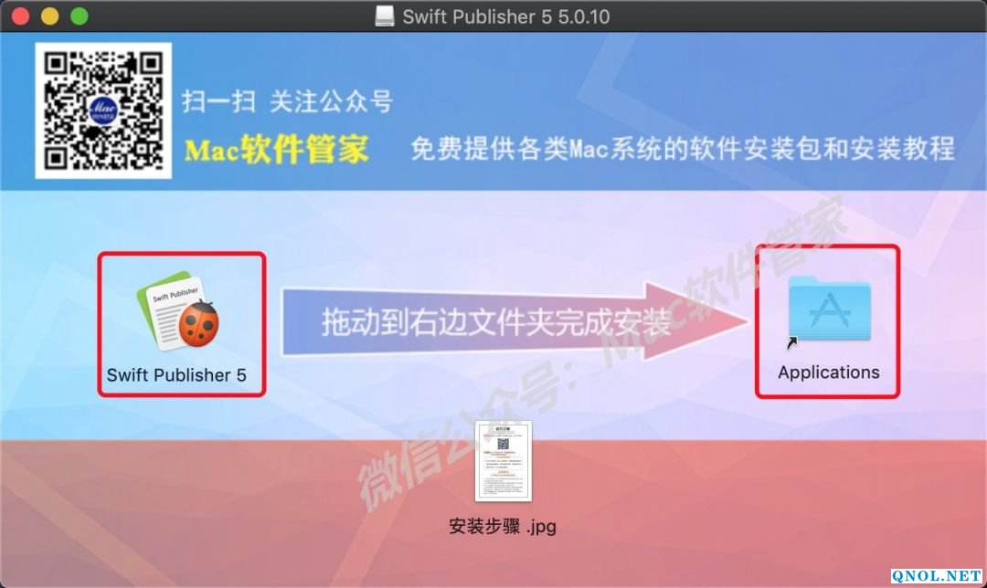 2.打开解压后的文件夹,将「Swift Publisher 5」拖到「Applications」文件夹里。