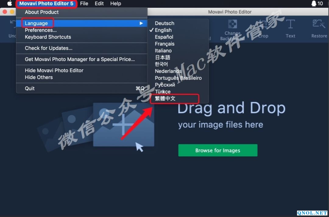 8.安装完成后软件后自动打开,点击顶部的「Movavi Photo Editor 5」,点击「Language」中的「繁体中文」。