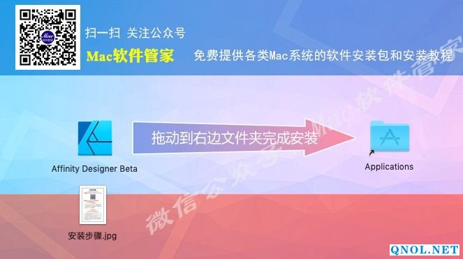 2.打开解压后的文件夹,将「Affinity Designer Beta」拖到「Applications」文件夹里。