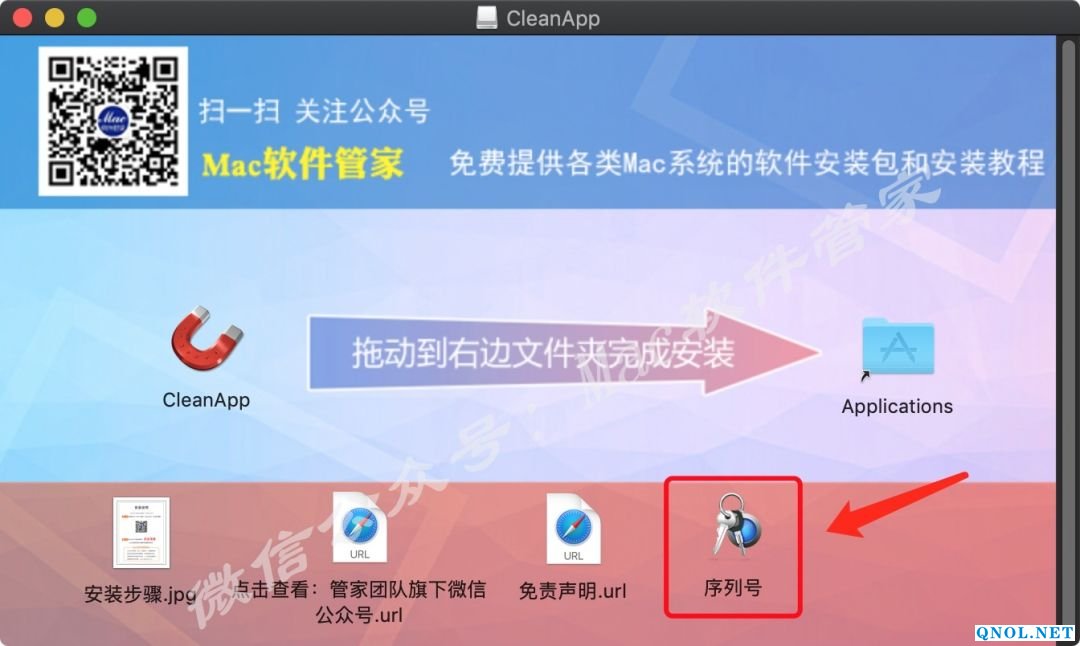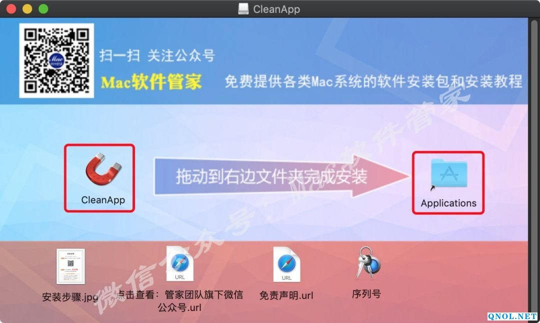 2.打开解压后的文件夹,将「CleanApp」拖到「Applications」文件夹里。