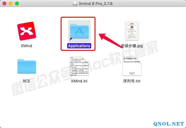 2.打开解压后的文件夹,将【XMind】拖动到【Applications】文件夹里。