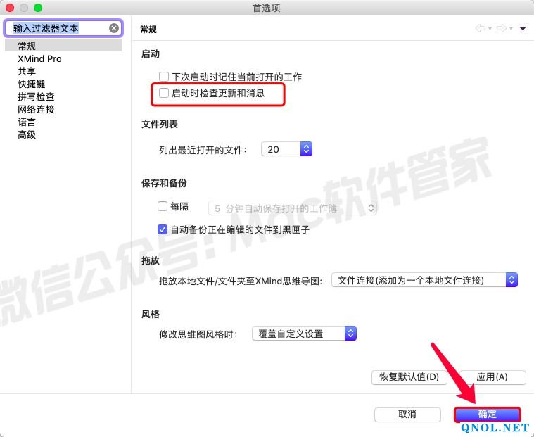 16.取消勾选【启动时检查更新和消息】,点击【确定】。