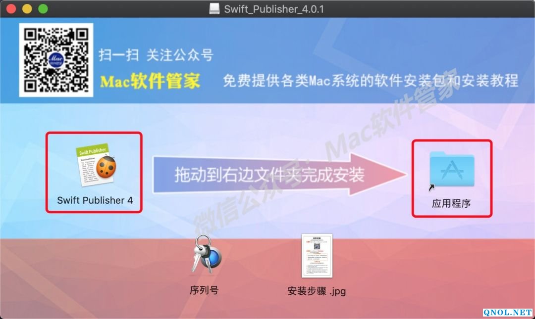2.打开解压后的文件夹,将「Swift Publisher 4」拖到「应用程序」文件夹里。