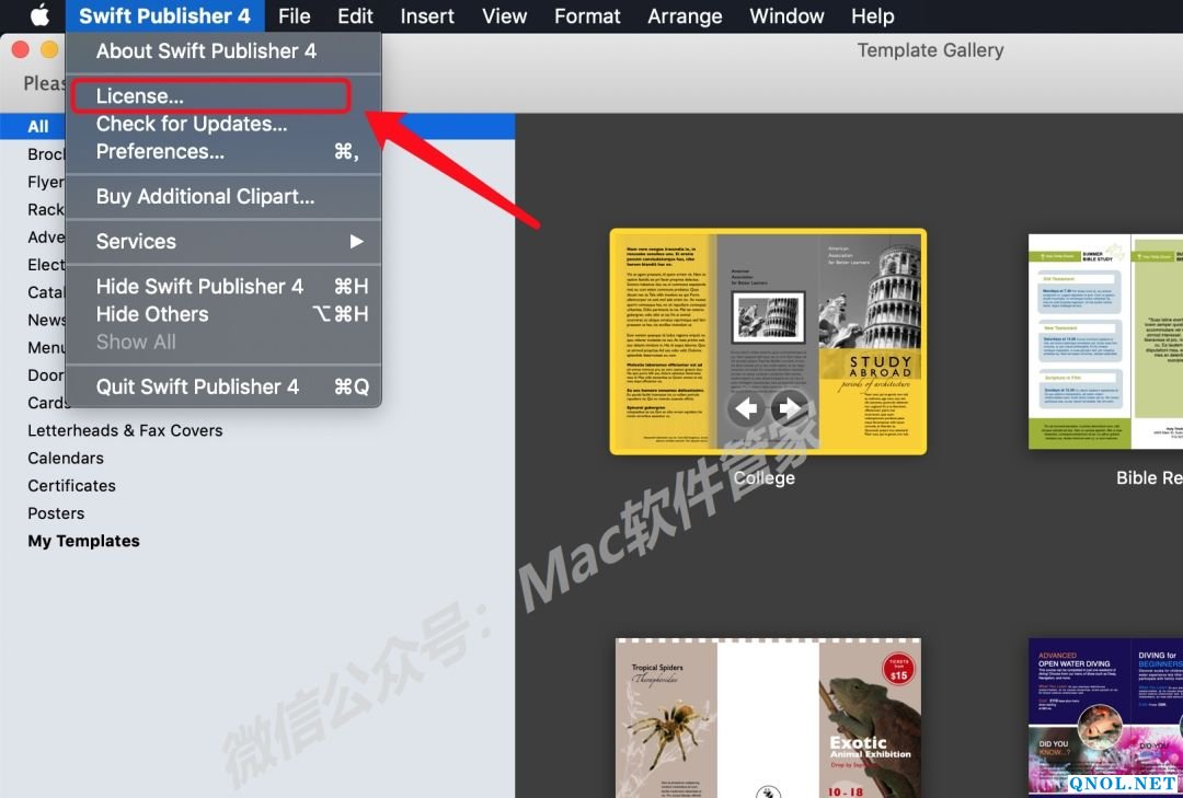 8.点击「Swift Publisher 4」,然后点击「License」。
